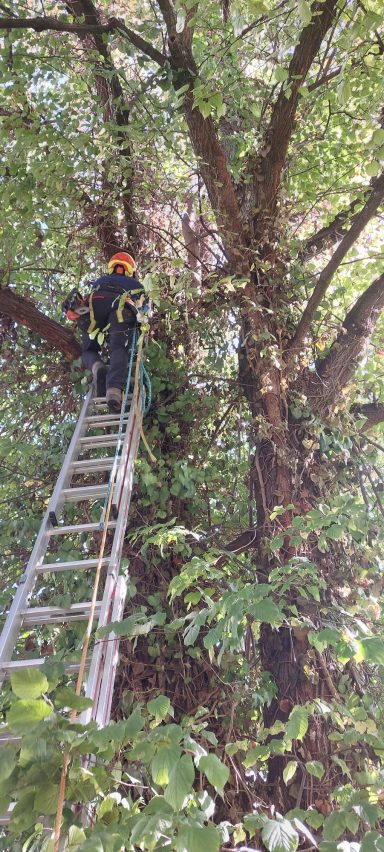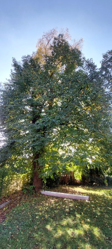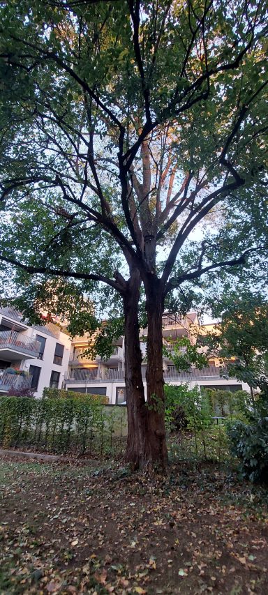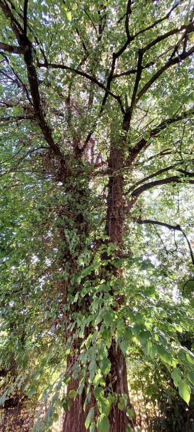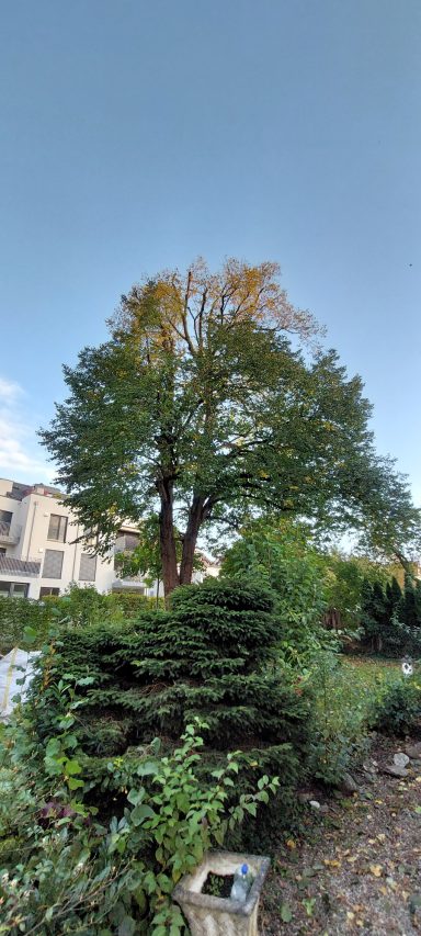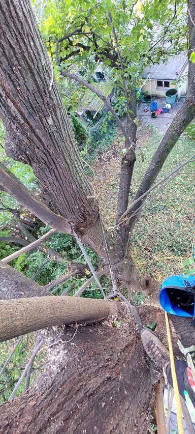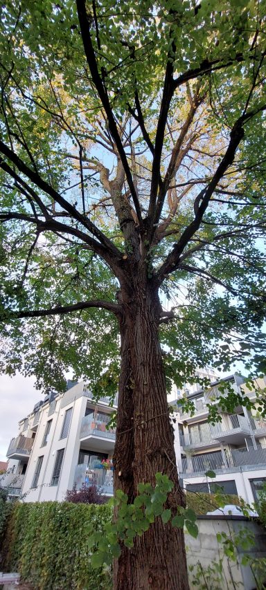 Im Herbst 2025 wurden wir mit Baumpflegearbeiten an einer über 100 Jahren alten Linde beauftragt. In der Folge von Bauarbeiten und unfachgerechter Baumpflege wurde die Substanz der Linde leider stark geschädigt. Abgebaggerten Wurzeln, für den Bau einer Tiefgarage, radikaler Einkürzung auf der Rückseite, um Platz für einen Neubau zu schaffen und einer unfachgerechte Kronensicherung mittels eines Spanngurts, welcher mittlerweile stark eingewachsen war, führten bereits dazu, dass die Spitze der Krone am absterben war und die Krone insgesamt viel Totholz hatte. Dazu kam noch, dass die Krone zunehmend von Efeu überwuchert wurde.